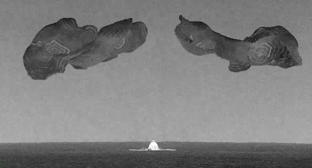 Paraquedas reduzem velocidade da espaçonave da SpaceX, na volta à Terra