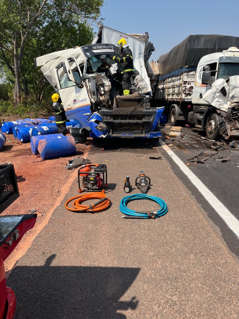 Segundo os bombeiros, motorista de caminhão não conseguiu parar na fila de “pare e siga”, causando o acidente. Os motoristas dos outros dois caminhões não se feriram. Batida aconteceu em trecho da BR-153