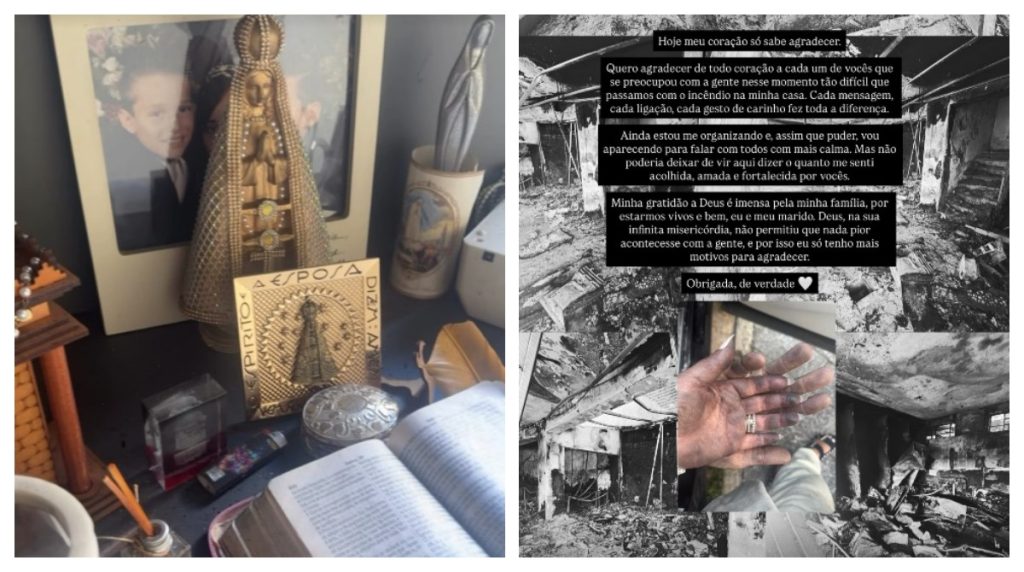 “Gente, a casa inteira queimou. Mas o cantinho da minha fé não queimou. Tá aqui, ó: olha minha Bíblia. A minha Nossa Senhora, aqui, ó, o Templo de Salomão. Tudo queimado, mas [aqui] não queimou. Mas Deus é bom demais, acreditem nele. Era pra gente estar morto, eu e minha esposa, Claudia. A prova tá aqui”, disse Rogério em lágrimas (veja vídeo acima).